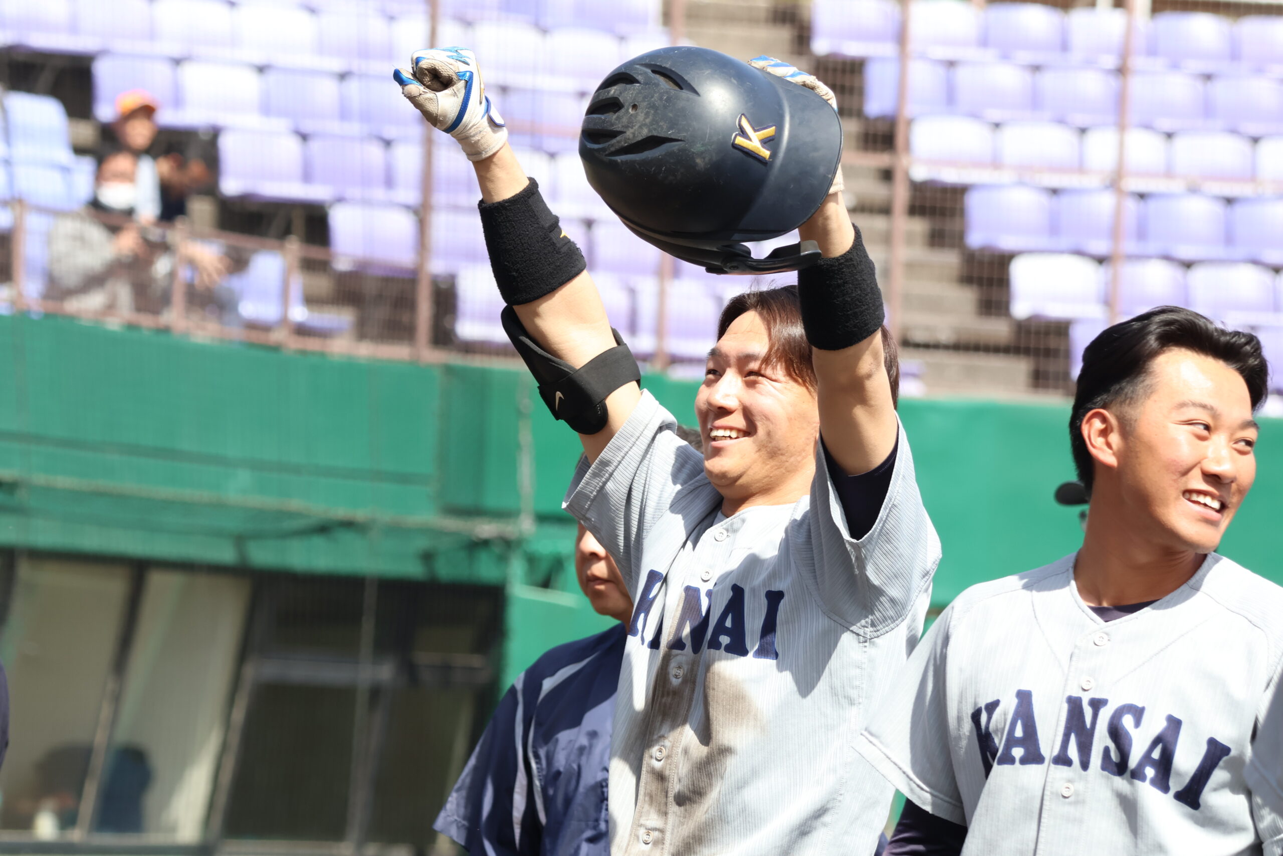 「(サヨナラ勝利を収めた今の気持ちは)ほっとしています。前半勝ちゲームやったのに、エラーして苦しい試合に持ち込んでしまったので、それでもなんとか粘れるのが今年のチームです。粘って粘って、最後に宮本が決めてくれたので良かったです。(3回には自身の適時打で3点を獲得した)勝負どころで打つのが僕の仕事だと思っていたので。打席に入る前に、河田に『つなぐわ』と呪文のように言っていたので、それが良かったのかなと思います。近大のエースピッチャーが出てきて勝ちに来ているなと感じたので、そこを打てばこっちも勢いがつくし相手もガクンと来るだろうと思っていました。莞爾とやましゅん(山本峻)には『力まんと、適当にやってこい』と言いました。(宮本青がサヨナラ打)あいつはもう何も言わなくてもやってくれるようなプレーヤーなので、期待しかしていなかったです。その中で、ちゃんと決めてきてくれるあたり。本当は僕たち4年生が背負わないといけないんですけど、それを先頭に立ってやってくれるプレーヤーです。(次戦・関関戦に向けて)きょう勝ち点を落として迎えるのと、今日勝って迎えるのとでは、大きな差だったので、サヨナラ勝ちというのも勢いがつくと思います。すごくいい球場め伝統の一戦なので、関係者各位に感謝して、必ずいい試合をして勝ちたいです」