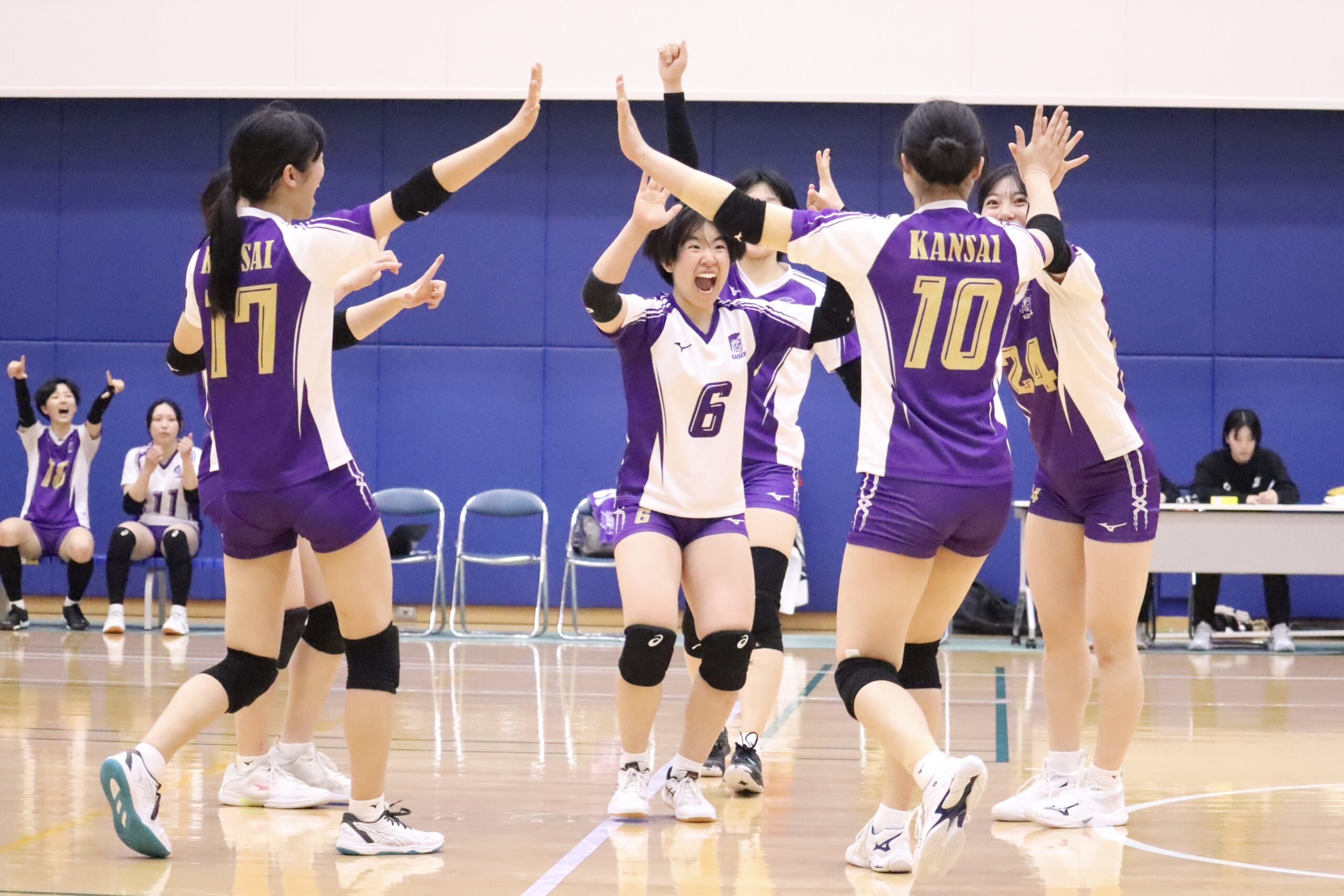 ストレートで取り切りたい第3セット。このセットもラリーを制し、序盤から相手にブレイクさせず関大がブレイクすることで点差を広げる。後山のサーブで乱れた3本目のボールを岩本がダイレクトで叩き込んだり、土屋の片手ブロックが飛び出すと、チームや会場は盛り上がりを見せた。関大の高く2枚揃ったブロックに対し、相手は対応しようとミスが出始める。後山がサイドで相手の攻撃を封じると、花岡もそれに続くように相手のブロード攻撃をコミットブロックで止めると、流れは完全に関大に。相手の強烈なジャンプサーブにも安定した返球で隙を見せない。中盤からは花岡がスタンディングでスパイクを決めたり、サービスエースを奪ったりと勢いに乗る。互いにサイドアウトが続いたが、牛田音羽(人1)のスパイクで先に25点目に到達。第3セットを奪い、ストレート勝利を決めた。